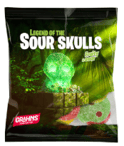 50g pussi kirpeitä hedelmäpääkalloja. Pussin ulkonäkö uudistettu, makeisissa sama tuttu maku.
