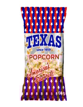Tänä päivänä myymämme Texas popcorn on 60g pussissa ja myyntierässä on 25 pussia.
