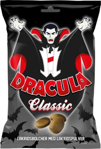- Dracula Classic 90g, kova lakritsimakeinen, päällystetty lakritsijauheella